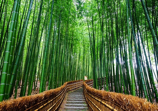아라시야마를 대표하는 명소 가운데 하나로 하늘을 찌를 듯 쑥쑥 자란 대나무가 울창한 숲을 이루고 있다.